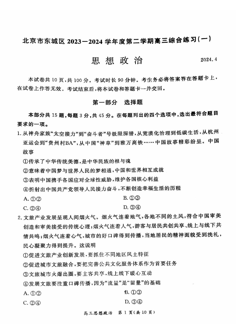 北京市东城区2024届度第二学期高三综合练习(一)政治+答案
