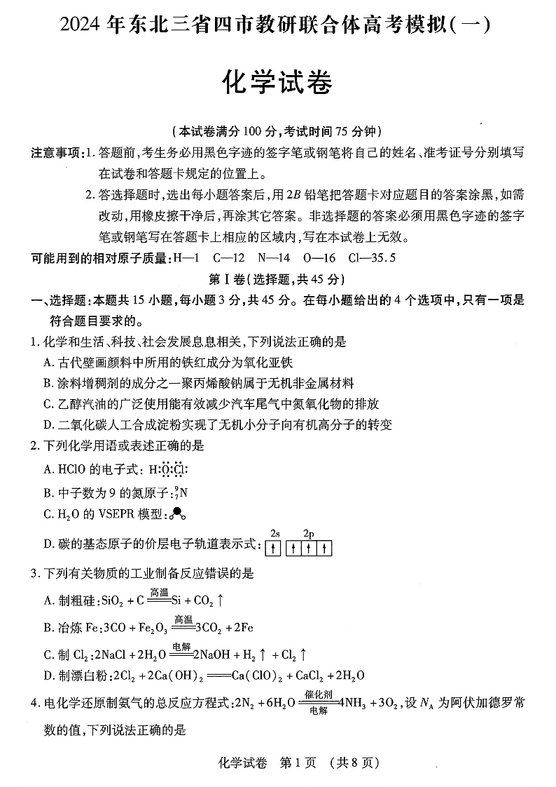 东北三省四市2024届教研联合体高考模拟(一)化学