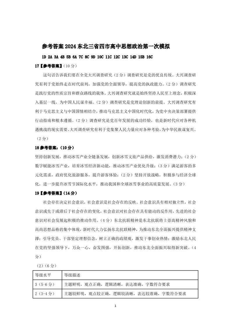 东北三省四市2024届教研联合体高考模拟(一)政治答案