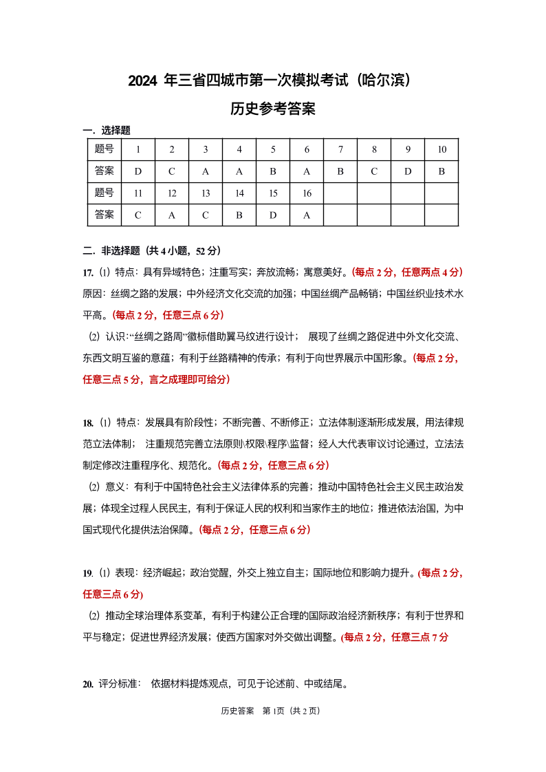 东北三省四市2024届教研联合体高考模拟(一)历史答案