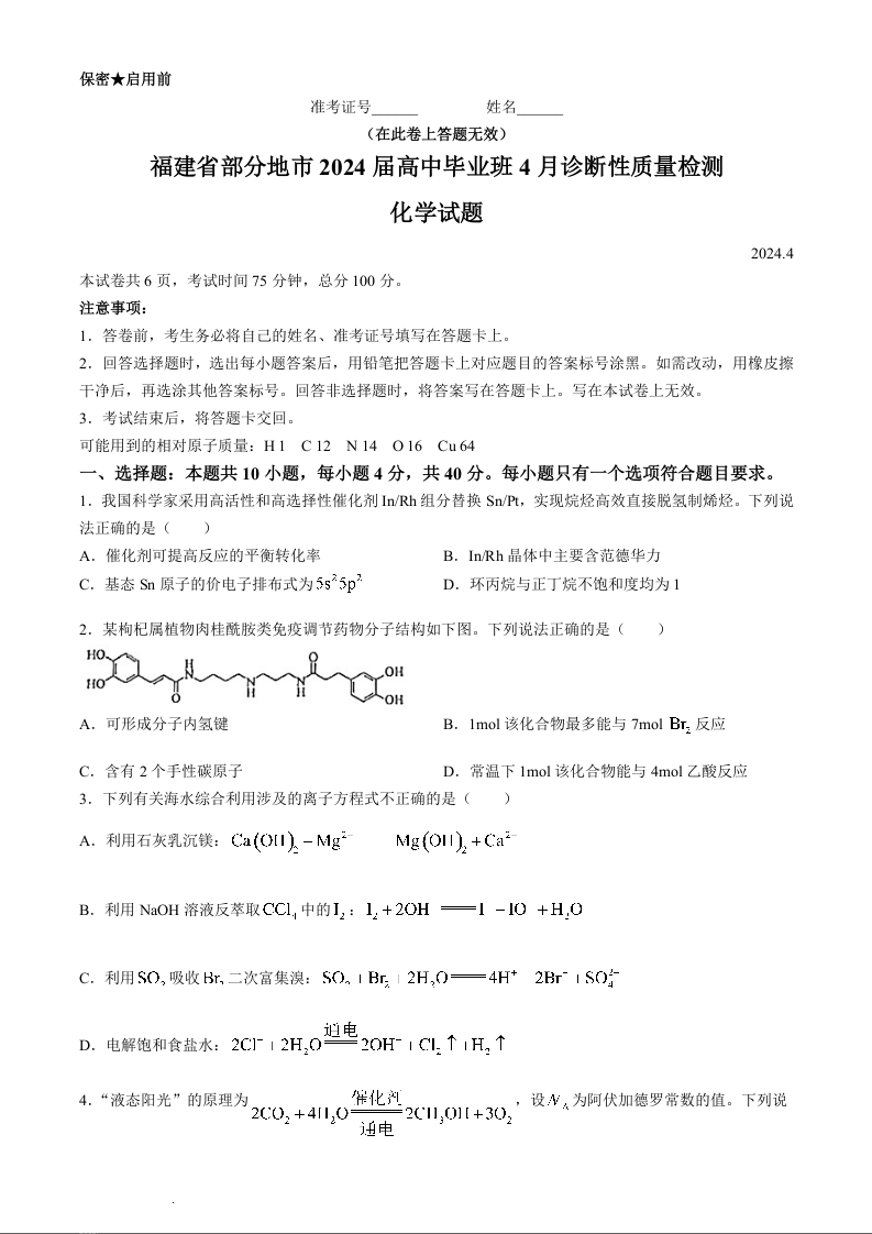 福建省部分地市2024届高中毕业班4月诊断性质量检测化学+答案