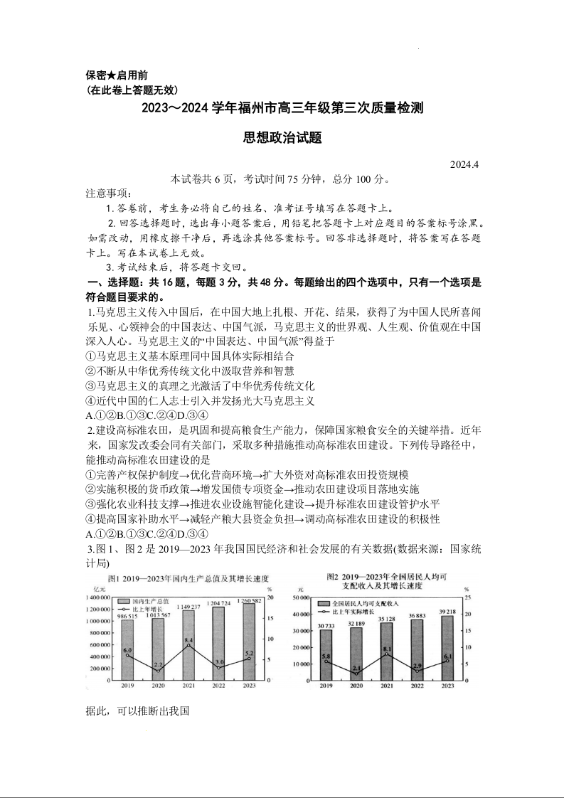 福建省部分地市2024届高中毕业班4月诊断性质量检测政治