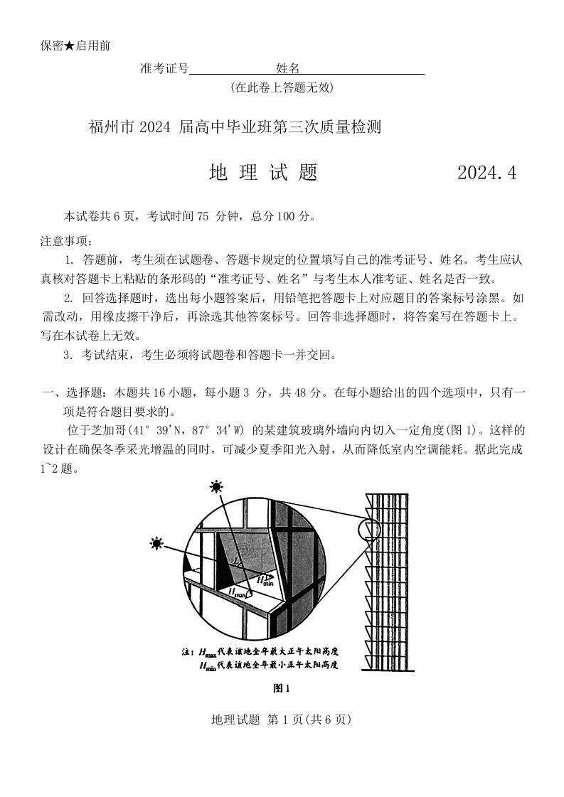 福建省部分地市2024届高中毕业班4月诊断性质量检测地理+答案