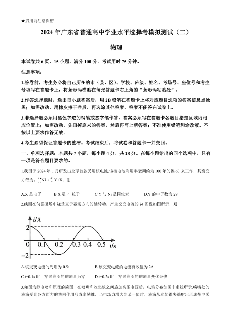 广东省2024年高三下学期普通高中学业水平选择考模拟考试(广东二模)物理+答案