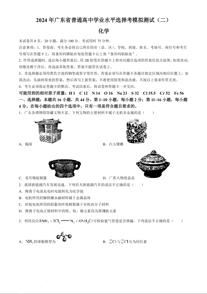 广东省2024年高三下学期普通高中学业水平选择考模拟考试(广东二模)化学+答案
