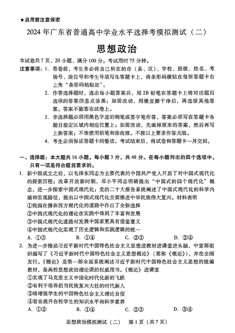广东省2024年高三下学期普通高中学业水平选择考模拟考试(广东二模)政治+答案