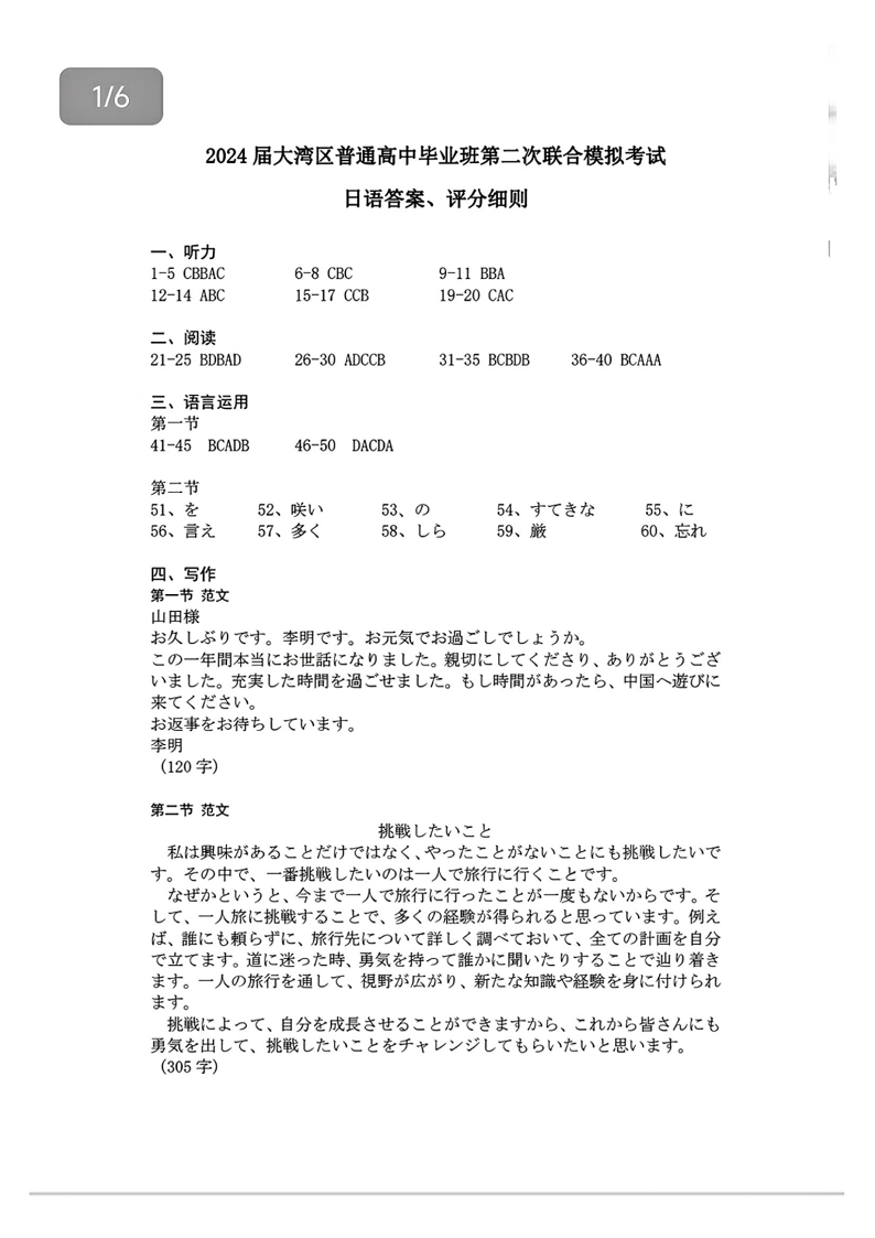 广东省大湾区2024届普通高中毕业年级联合模拟考试(二)日语答案