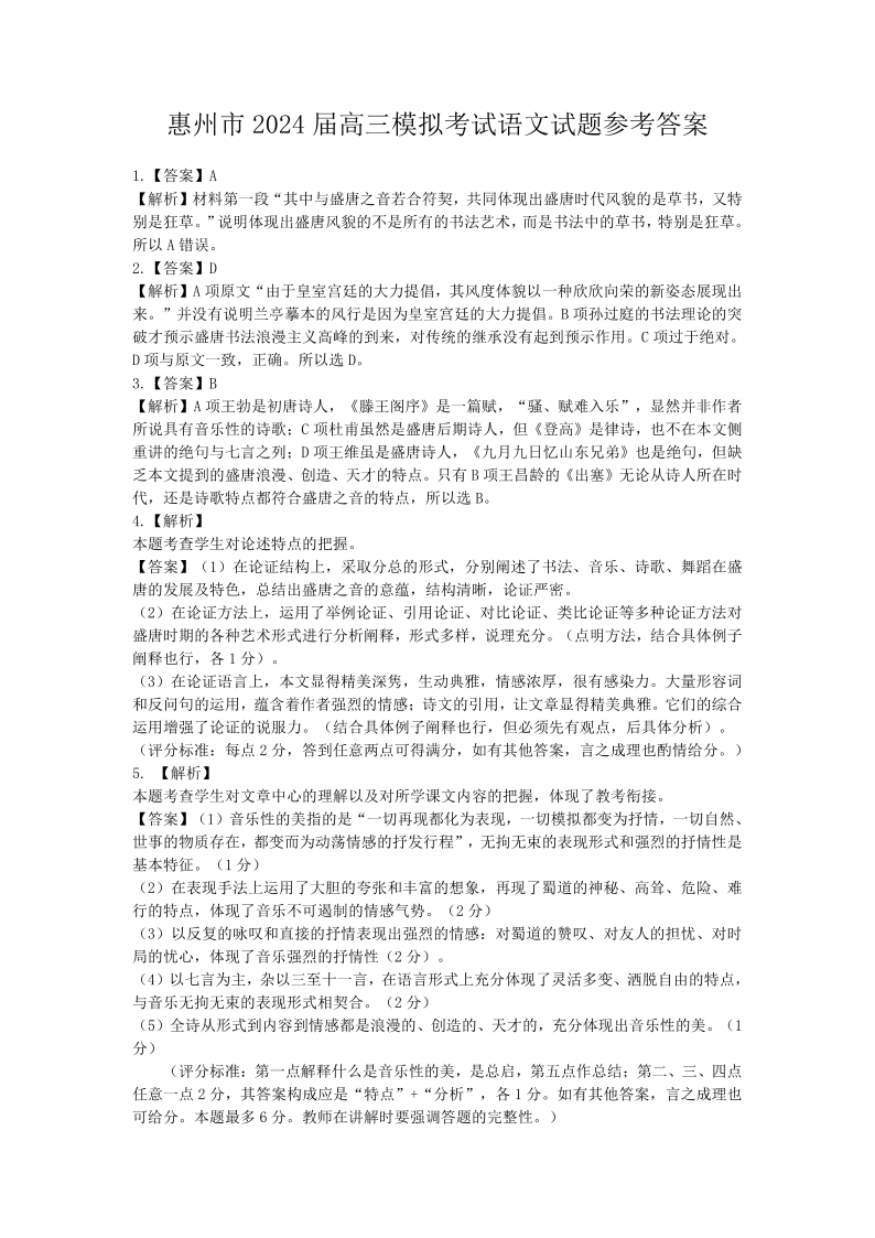 广东省惠州市2024届高三4月模拟考试(惠州一模)语文答案