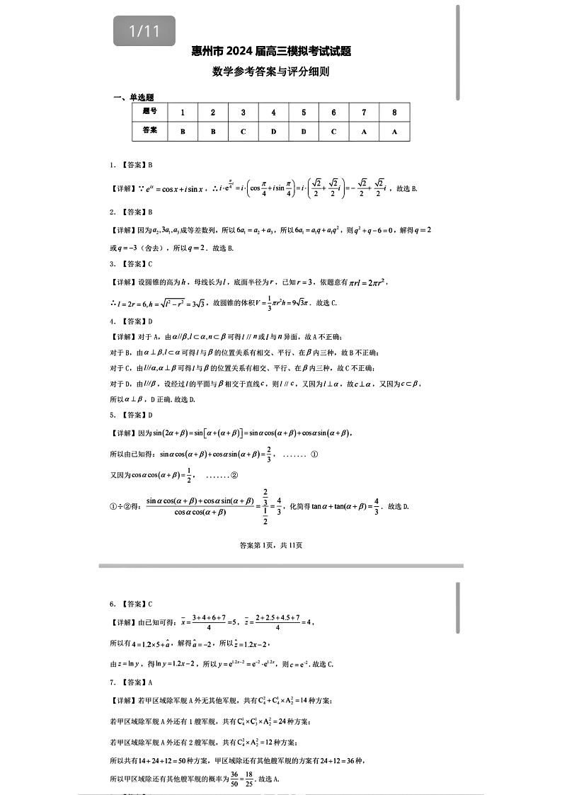 广东省惠州市2024届高三4月模拟考试(惠州一模)数学答案