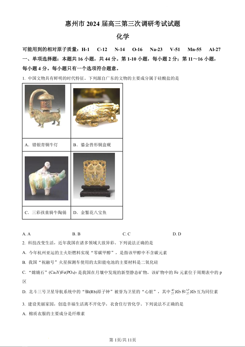 广东省惠州市2024届高三4月模拟考试(惠州一模)化学(原卷版)