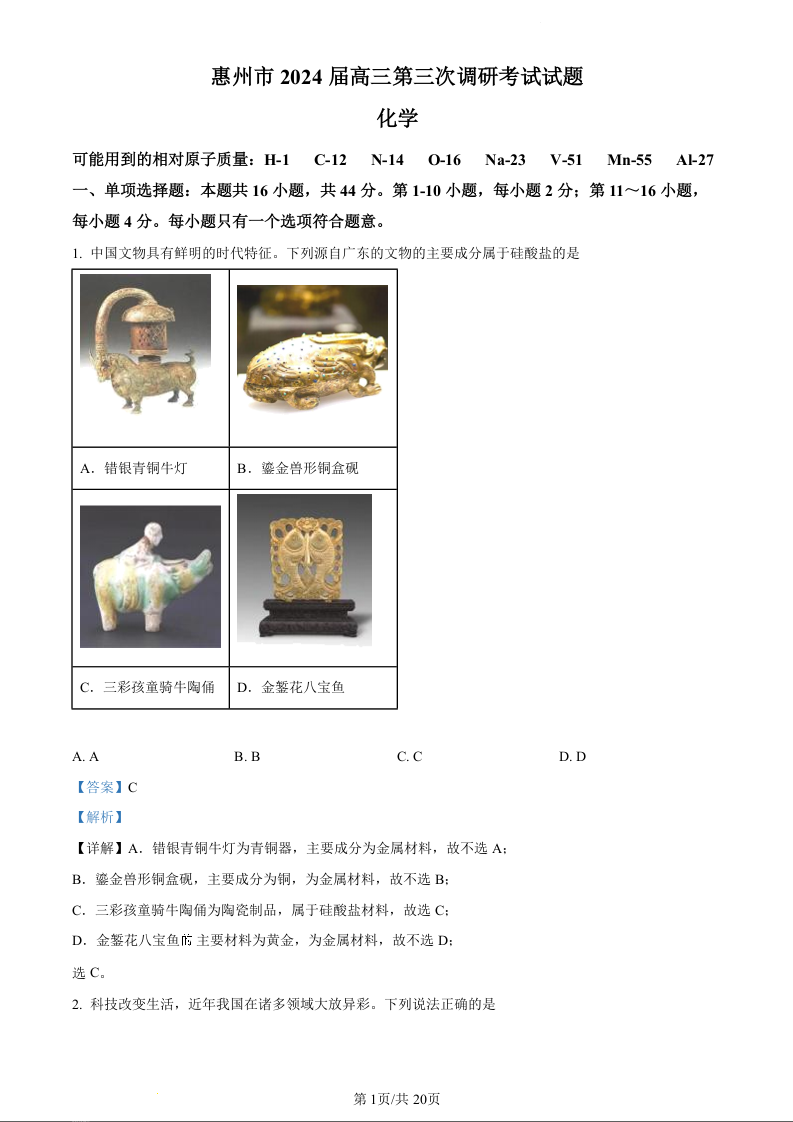 广东省惠州市2024届高三4月模拟考试(惠州一模)化学(精品解析版)