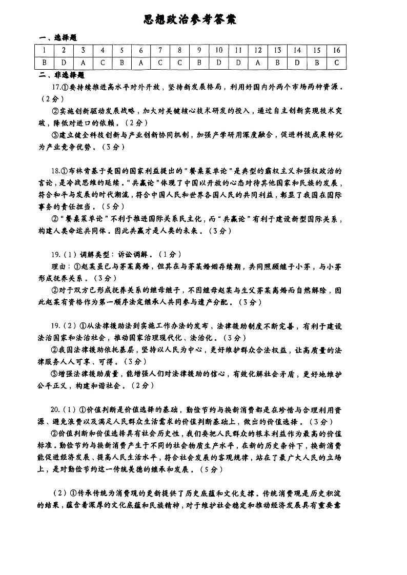 广东省惠州市2024届高三4月模拟考试(惠州一模)政治答案