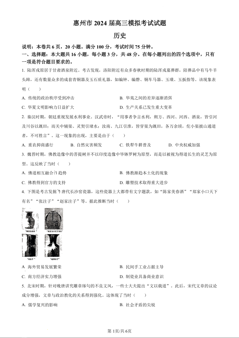 广东省惠州市2024届高三4月模拟考试(惠州一模)历史(原卷版)