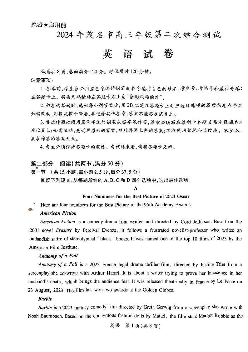 广东省茂名2024年高三年级第二次综合测试(茂名二模)英语