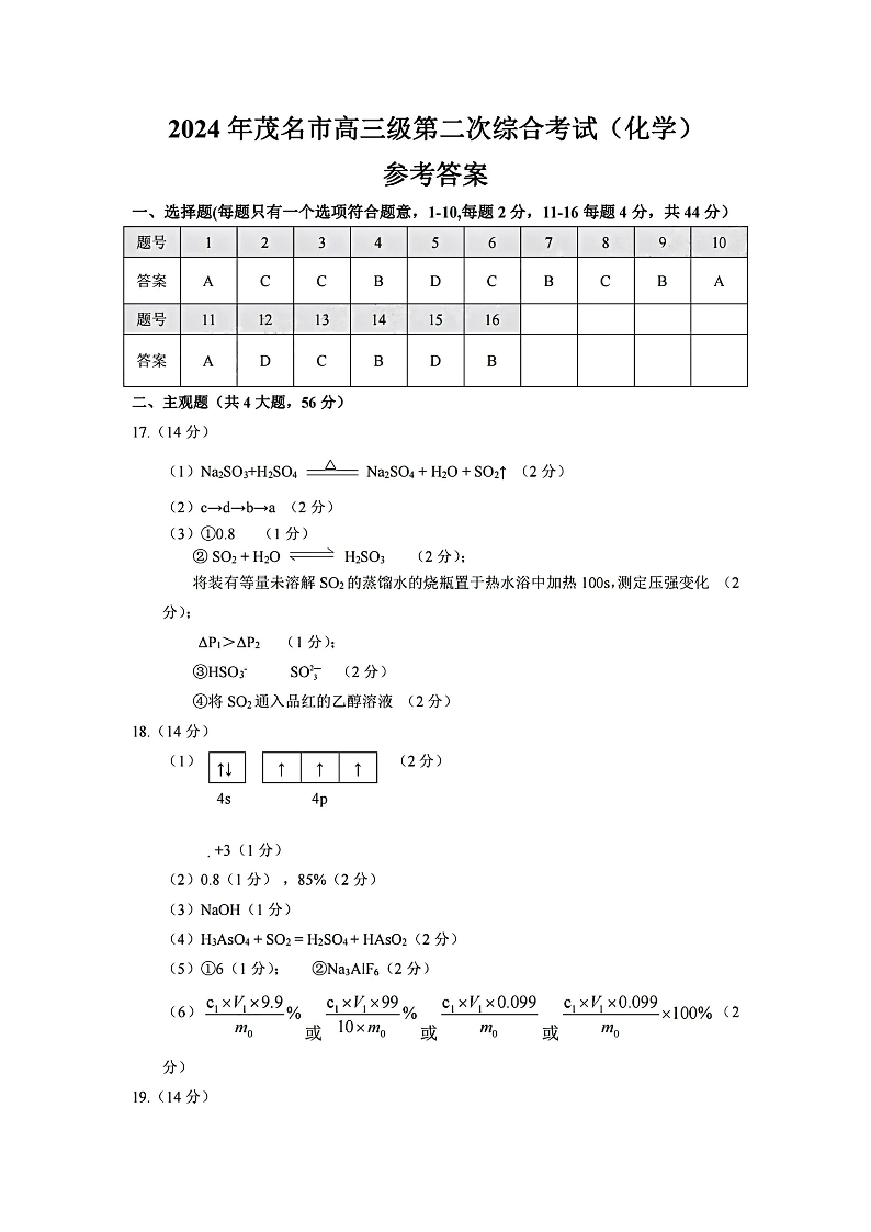 广东省茂名2024年高三年级第二次综合测试(茂名二模)化学答案