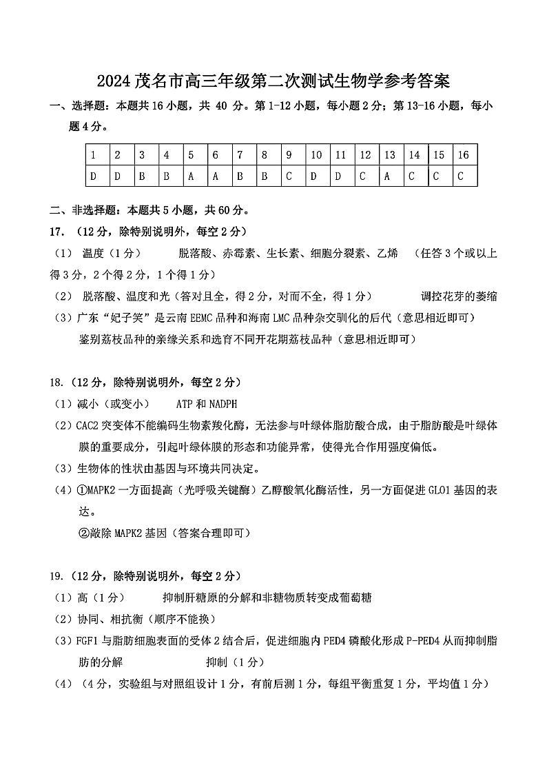 广东省茂名2024年高三年级第二次综合测试(茂名二模)生物答案