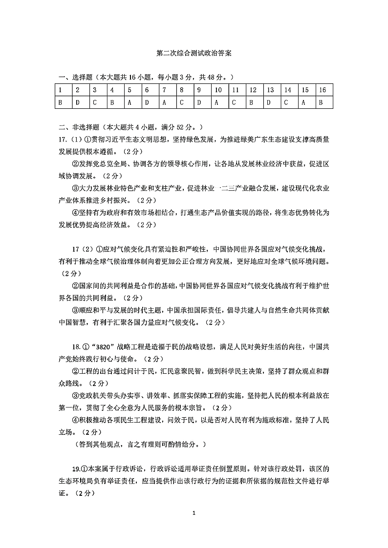 广东省茂名2024年高三年级第二次综合测试(茂名二模)政治答案