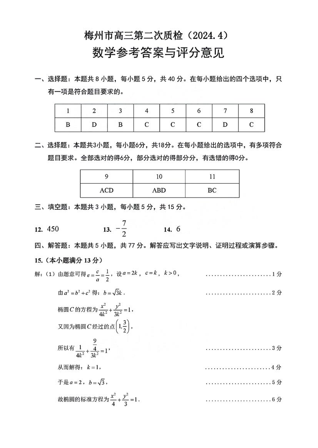 广东省梅州市2024届高三年级4月总复习质检(二模)数学答案