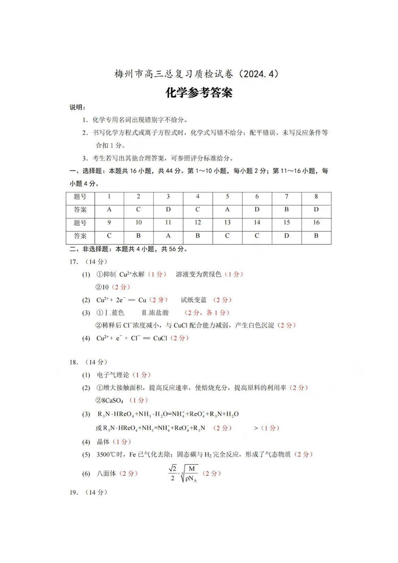 广东省梅州市2024届高三年级4月总复习质检(二模)化学答案
