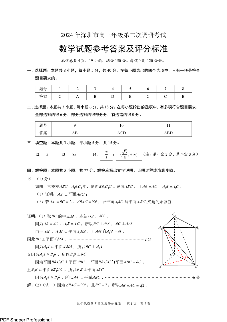广东省深圳市2024届高三年级第二次调研考试数学答案
