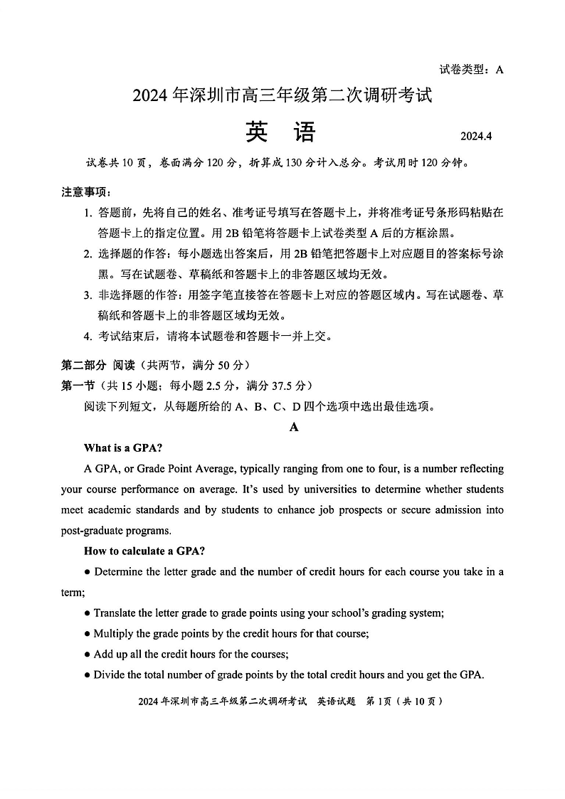 广东省深圳市2024届高三年级第二次调研考试英语