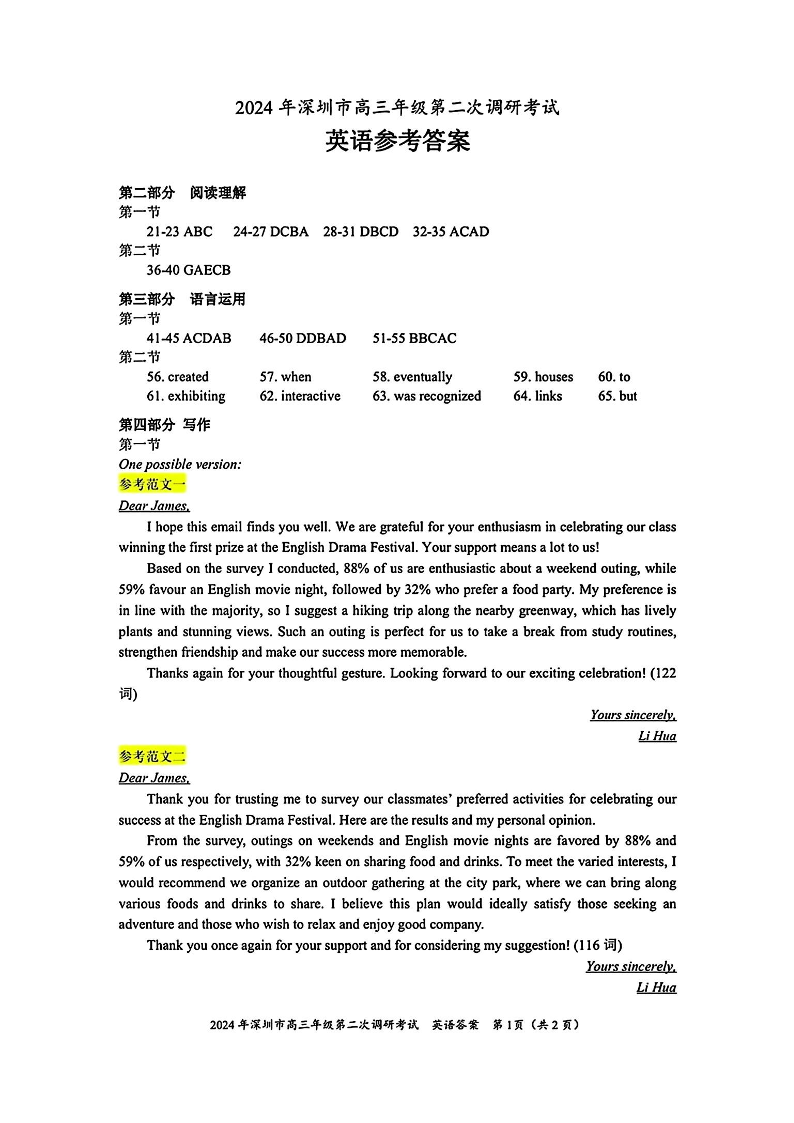 广东省深圳市2024届高三年级第二次调研考试英语答案