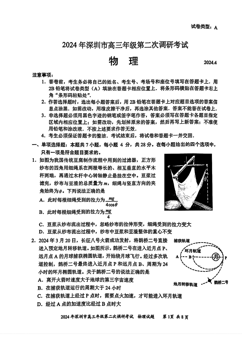 广东省深圳市2024届高三年级第二次调研考试物理