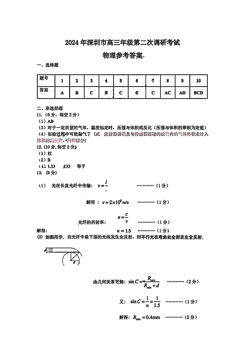广东省深圳市2024届高三年级第二次调研考试物理答案