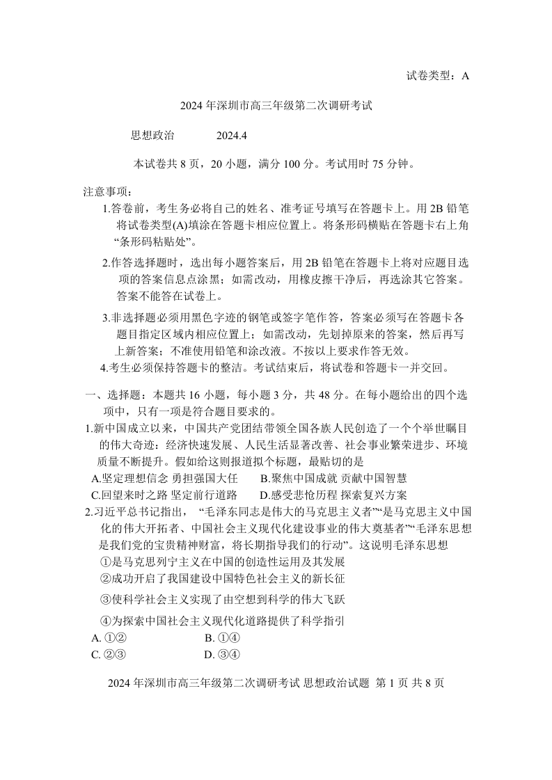 广东省深圳市2024届高三年级第二次调研考试政治+答案