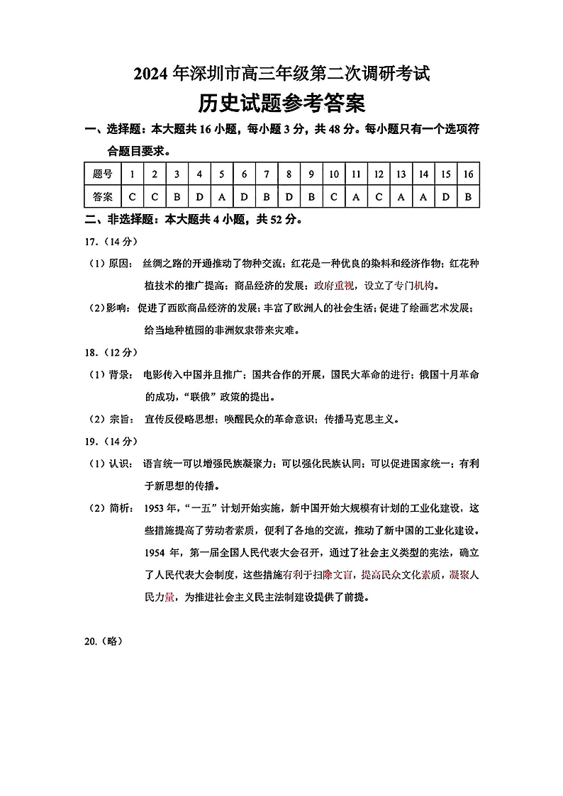 广东省深圳市2024届高三年级第二次调研考试历史答案