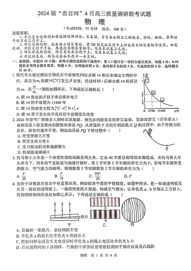 广西省2024届“贵百河”4月高三质量调研联考物理