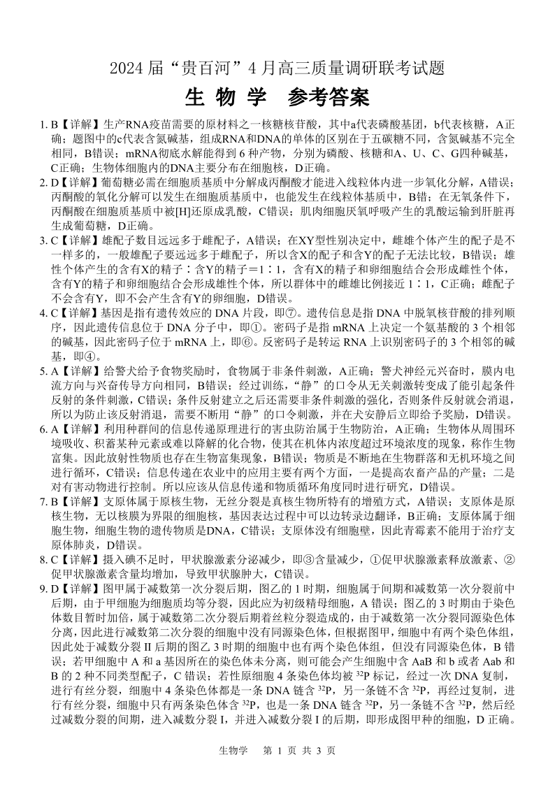 广西省2024届“贵百河”4月高三质量调研联考生物答案