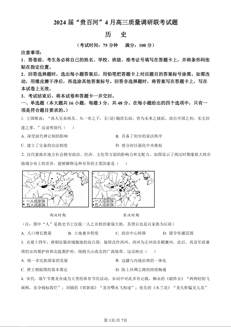 广西省2024届“贵百河”4月高三质量调研联考历史(原卷版)