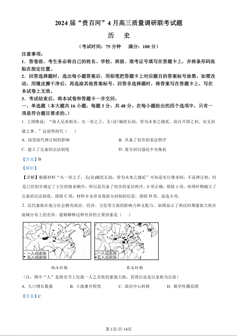 广西省2024届“贵百河”4月高三质量调研联考历史(精品解析版)