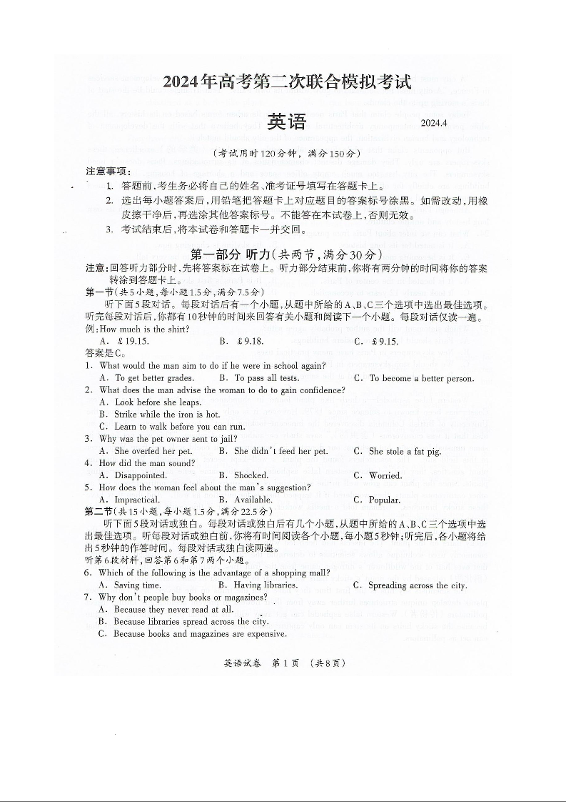 广西省2024年高考第二次联合模拟考试英语