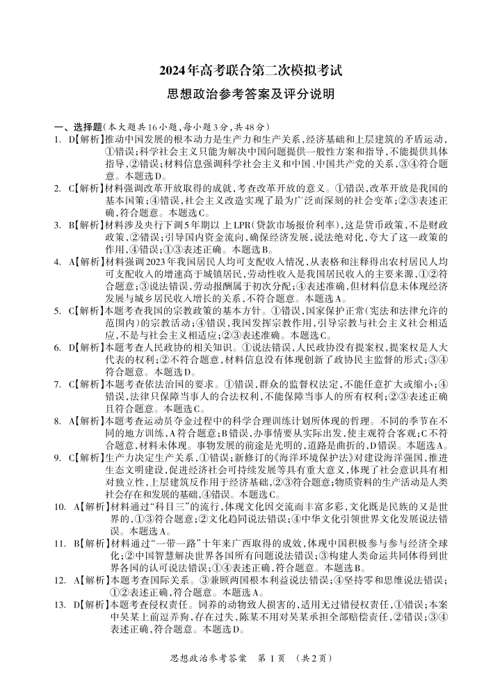 广西省2024年高考第二次联合模拟考试政治答案