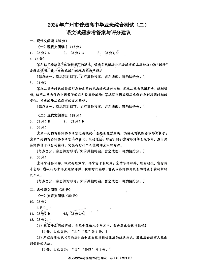 广州市2024 年普通高中毕业班综合测试(二)(广州二模)语文答案