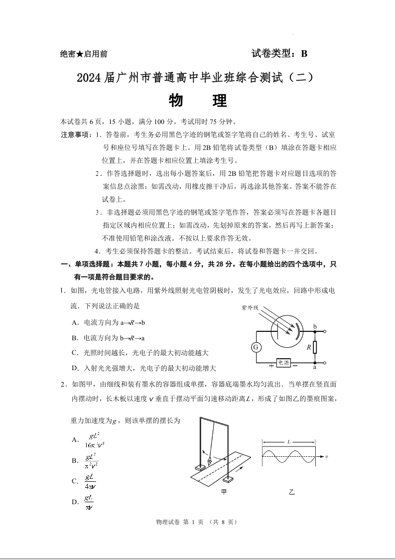 广州市2024 年普通高中毕业班综合测试(二)(广州二模)物理+答案