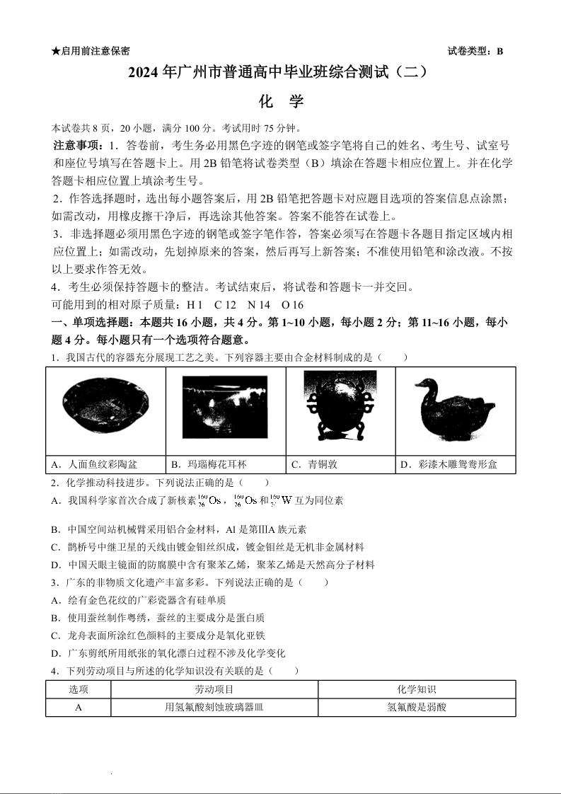 广州市2024 年普通高中毕业班综合测试(二)(广州二模)化学