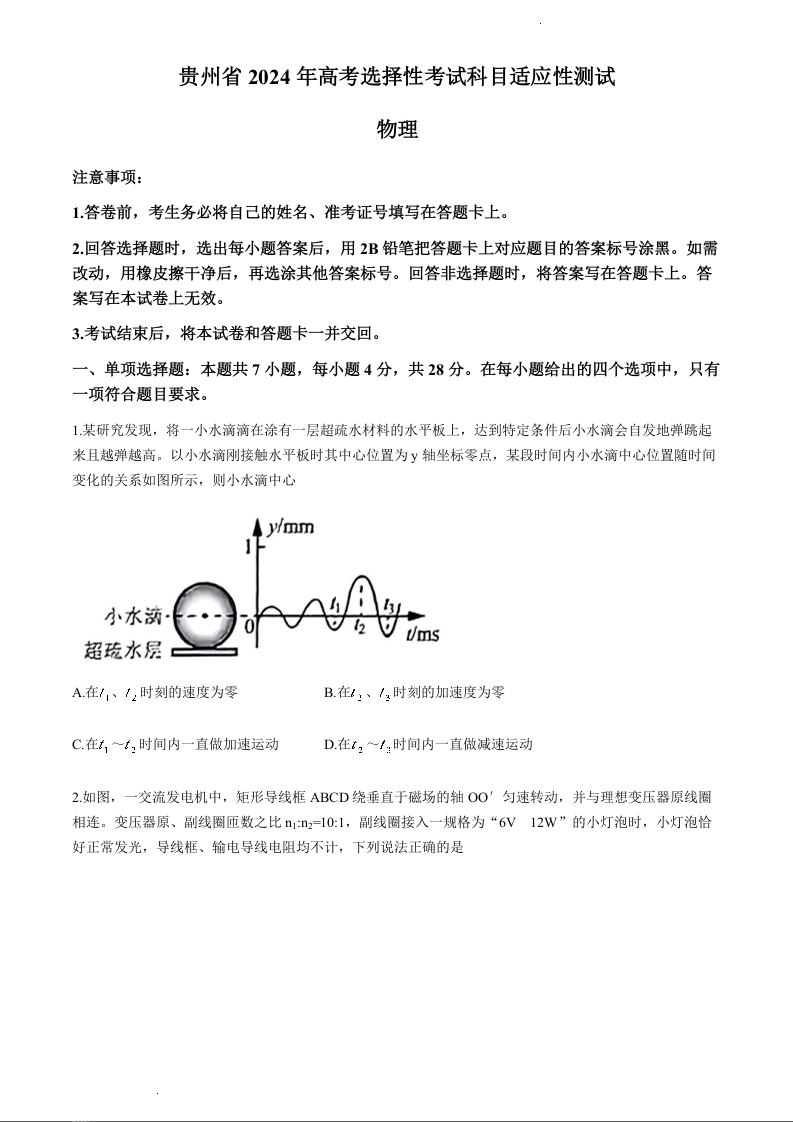 贵州省2024年高三年级4月适应性考试物理
