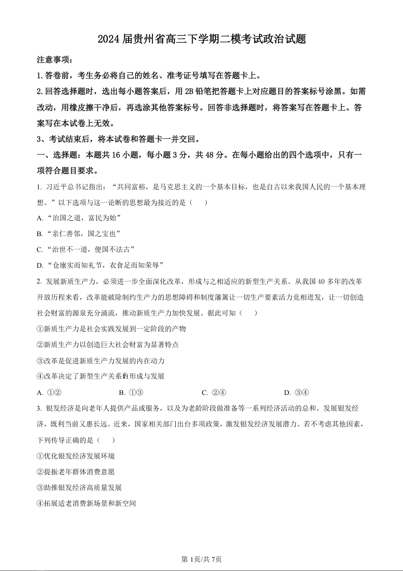 贵州省2024年高三年级4月适应性考试政治(原卷版)
