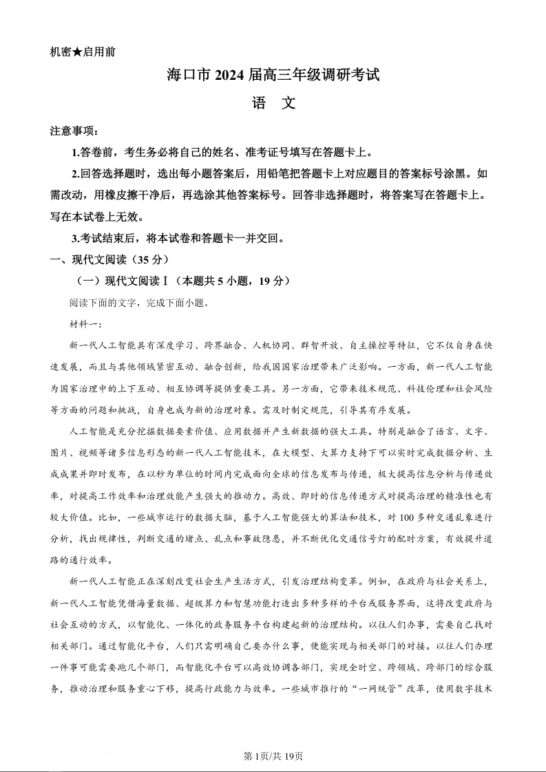 海南省海口市2024届高三下学期一模(4月调研)(海口一模)语文(精品解析版)