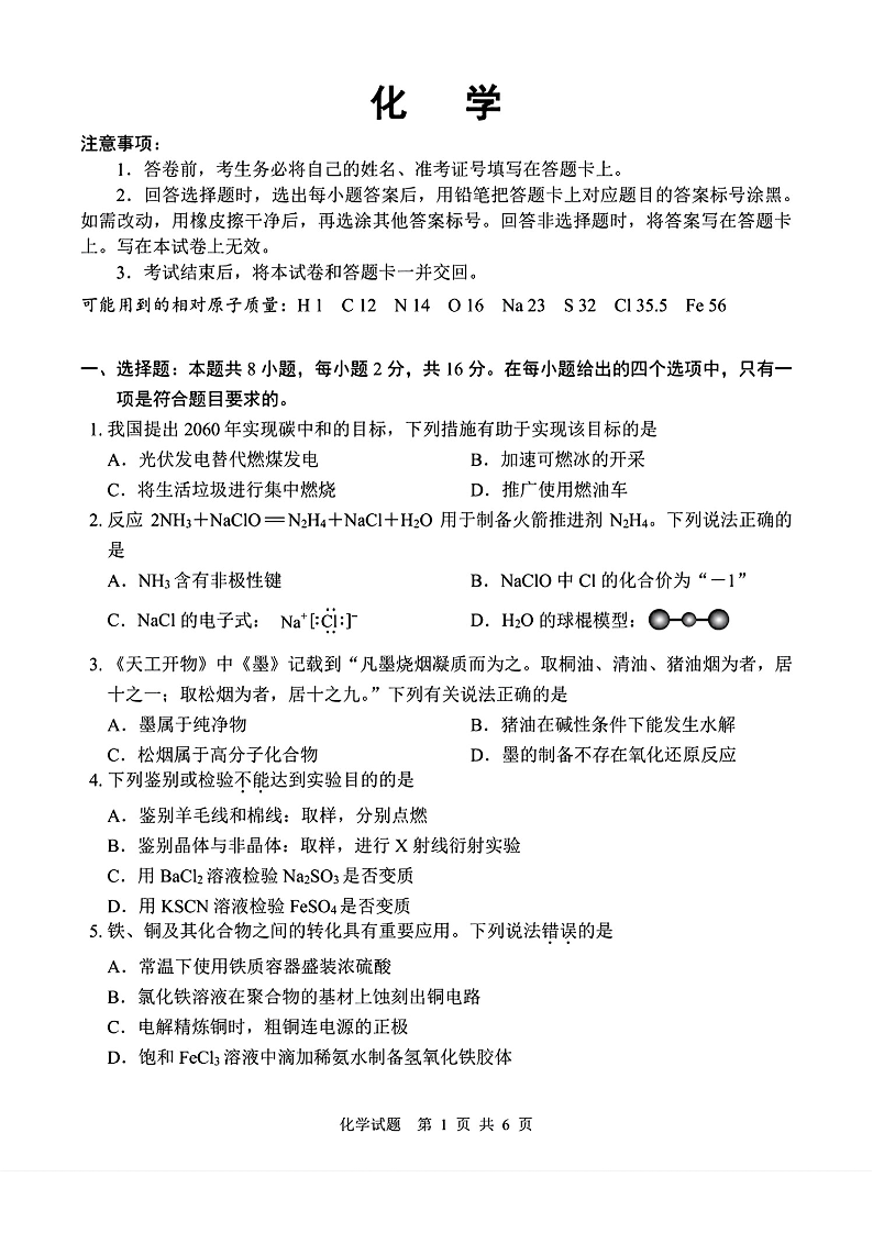 海南省海口市2024届高三下学期一模(4月调研)(海口一模)化学+答案