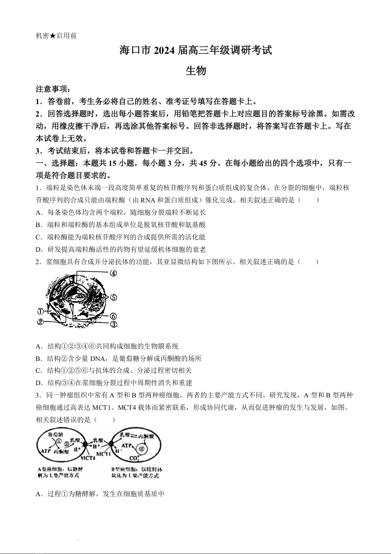 海南省海口市2024届高三下学期一模(4月调研)(海口一模)生物