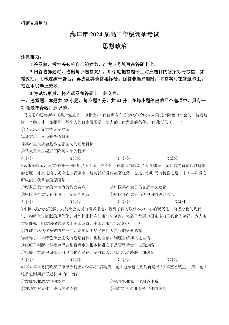 海南省海口市2024届高三下学期一模(4月调研)(海口一模)政治+答案