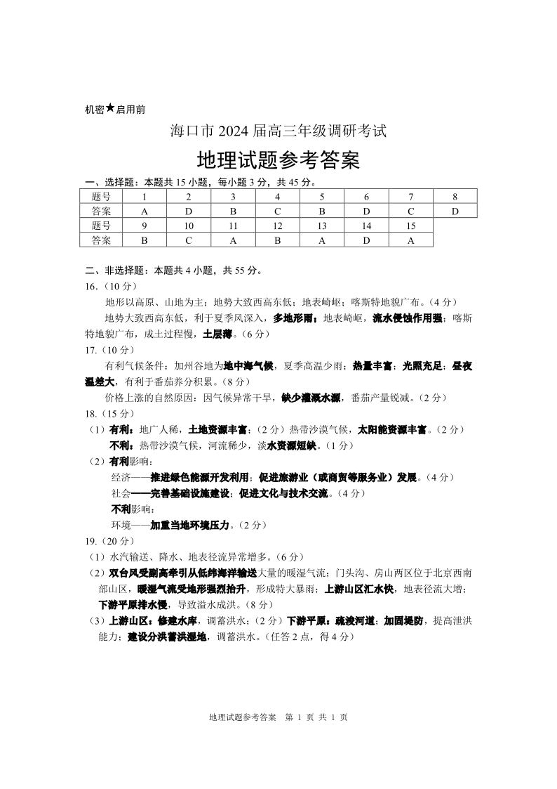 海南省海口市2024届高三下学期一模(4月调研)(海口一模)地理答案