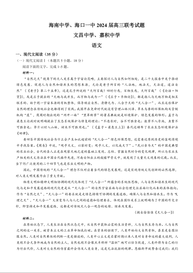 海南省四校(海南中学、海口一中、文昌中学、嘉积中学)2024届高三下学期一模语文+答案