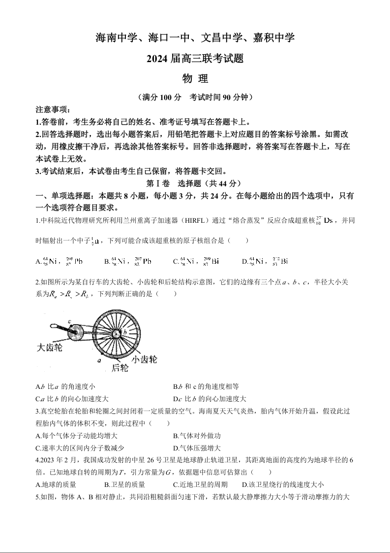 海南省四校(海南中学、海口一中、文昌中学、嘉积中学)2024届高三下学期一模物理+答案