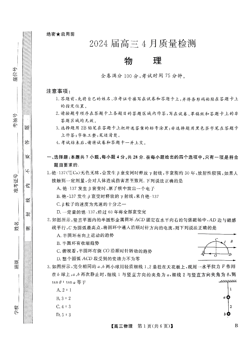 河北金科大联考2024届高三4月质量检测物理+答案