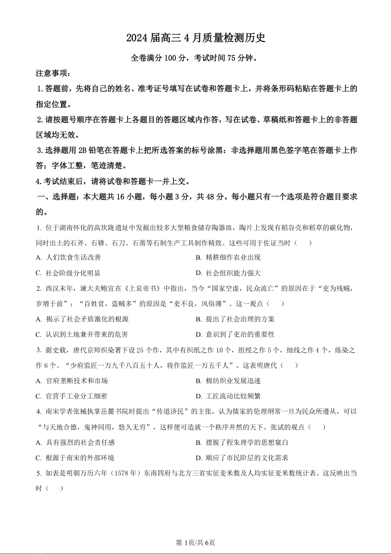 河北金科大联考2024届高三4月质量检测历史(原卷版)